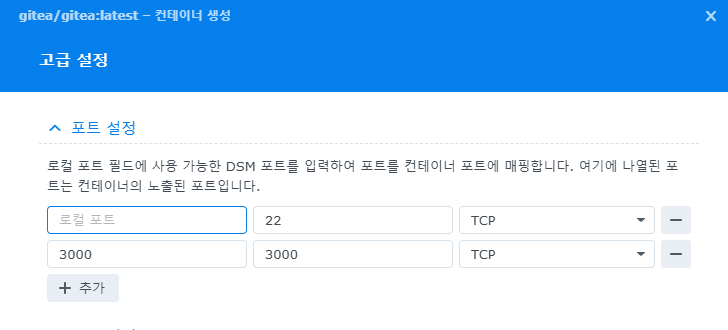 그 환경의 3000번 포트는 호스트(여기서는 Synology NAS)의 3000번 포트로 매핑이 되고, 22번 포트는 (에를들어 호스트 포트로 2222로 설정했다면..) 2222 포트로 매핑이 되는것이다. - 그러면 외부에서 <NAS IP>:3000 주소를 입력하면 해당 Docker의 환경에 접속하는것이다.