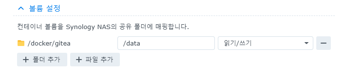 - 원하는 폴더에 컨테이너 경로는 /data로 설정해서 매핑하자.(보통 /docker/gitea 국룰)