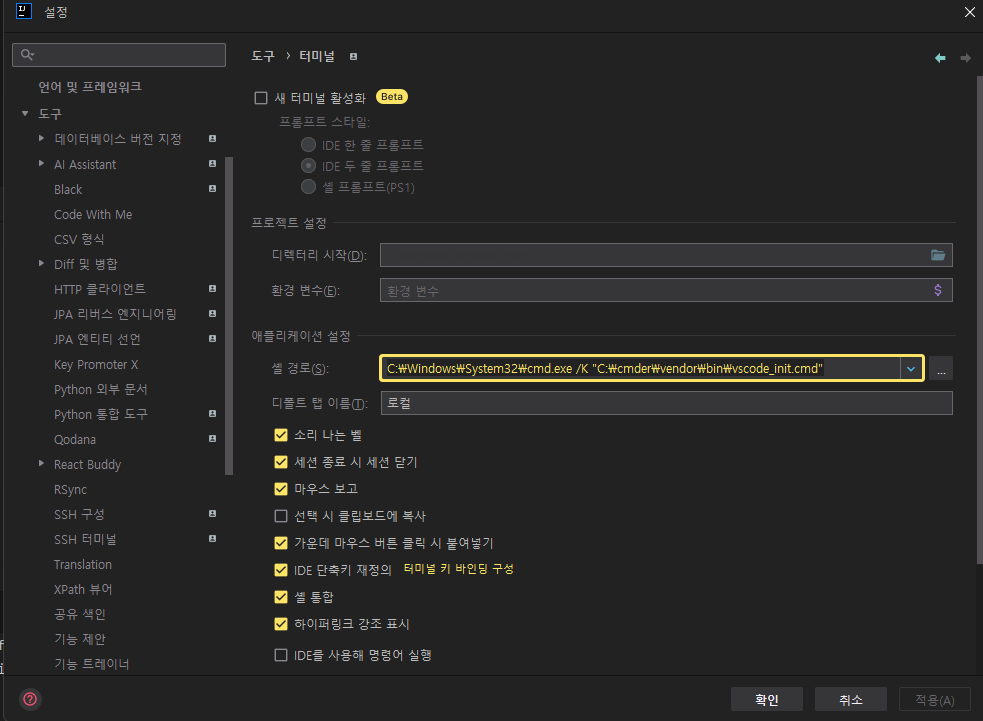 ์ ์ฉํ๋ฉด ์ด์ IDEA์ ํฐ๋ฏธ๋์์๋ cmder์ ์ฌ์ฉํ ์ ์๋ค.